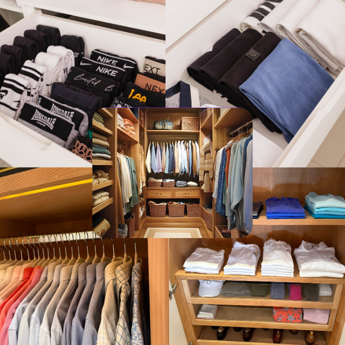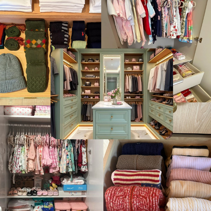 Organisation by category, colour, and frequency of use, with professional folding systems and hangers.